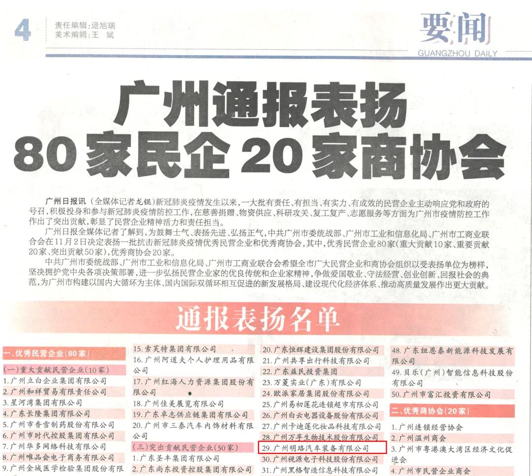 11月2日,為鼓舞士氣、表揚先進、弘揚正氣,中共廣州市委統(tǒng)戰(zhàn)部、廣州市工業(yè)和信息化局、廣州市工商業(yè)聯(lián)合會決定表揚一批抗擊新冠肺炎疫情優(yōu)秀民營企業(yè)和優(yōu)秀商協(xié)會,此次共80家優(yōu)秀民營企業(yè)獲通報表揚,廣州明珞裝備股份有限公司光榮上榜,并以優(yōu)秀表現(xiàn)榮獲“廣州市抗擊新冠肺炎疫情突出貢獻民營企業(yè)”稱號。