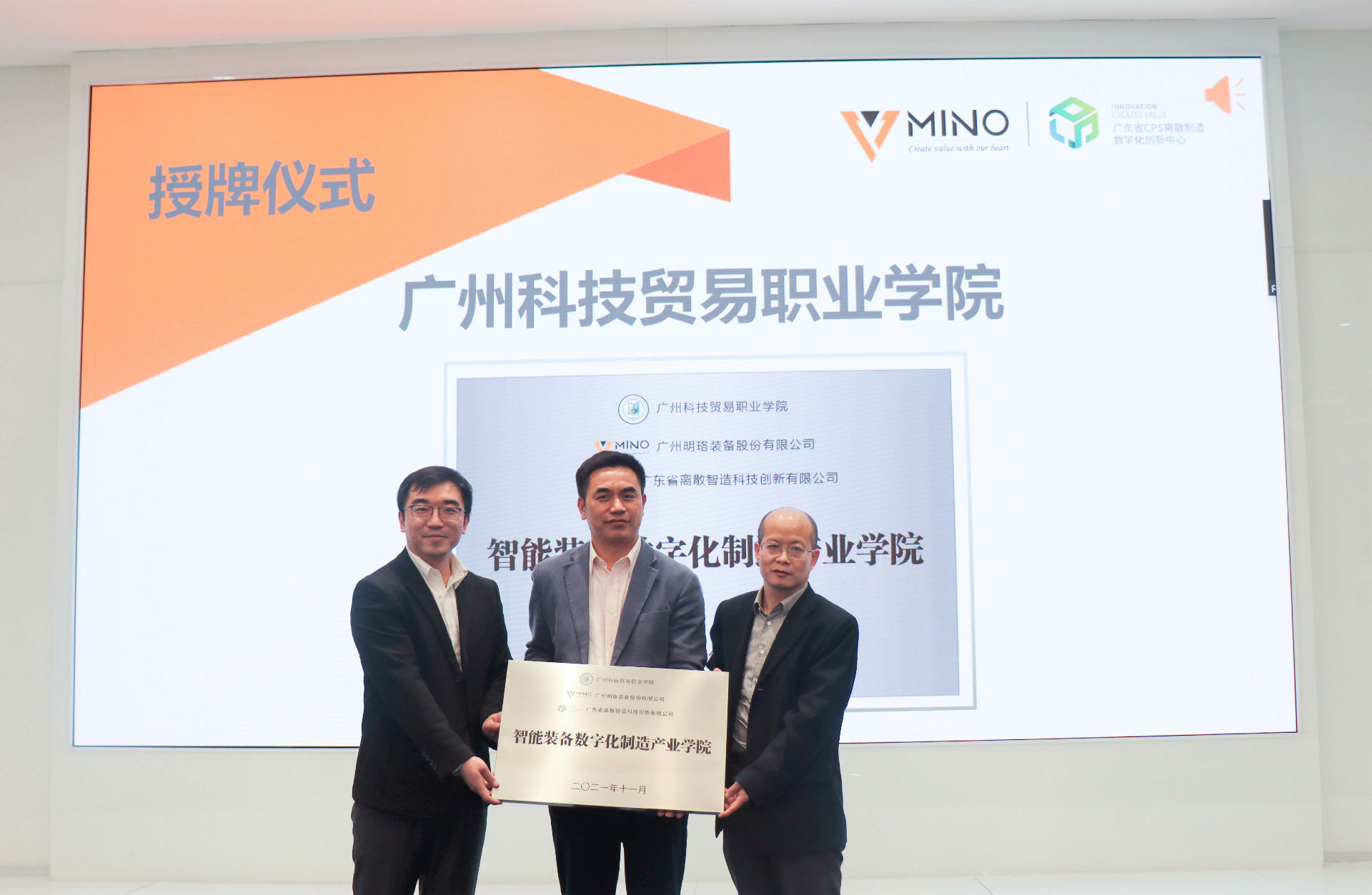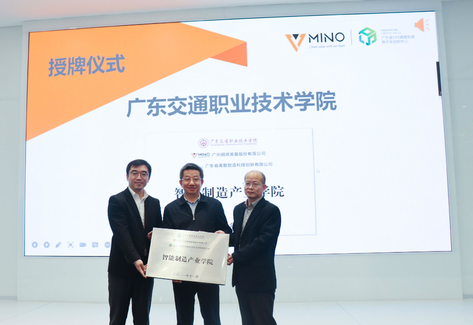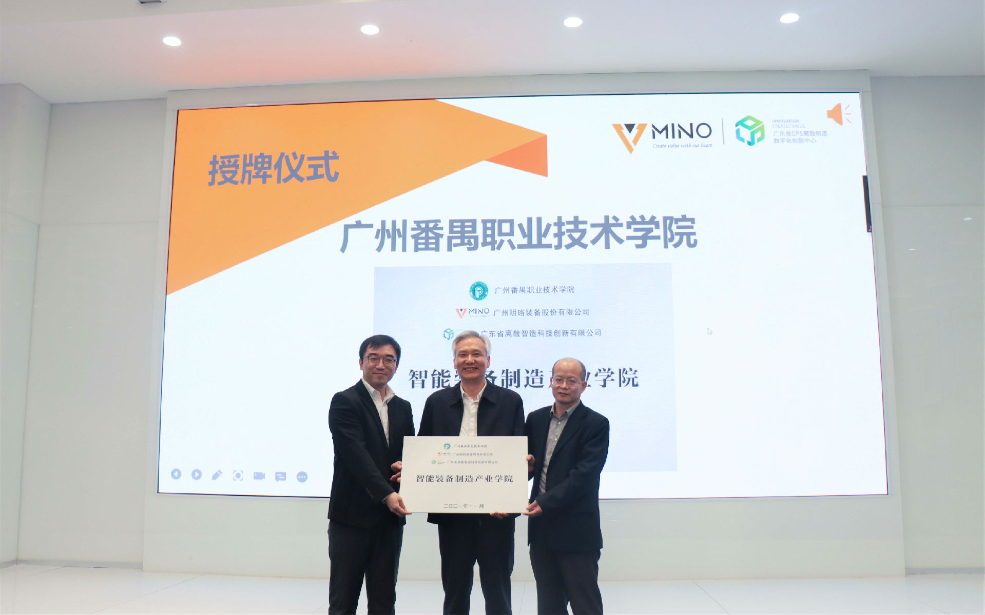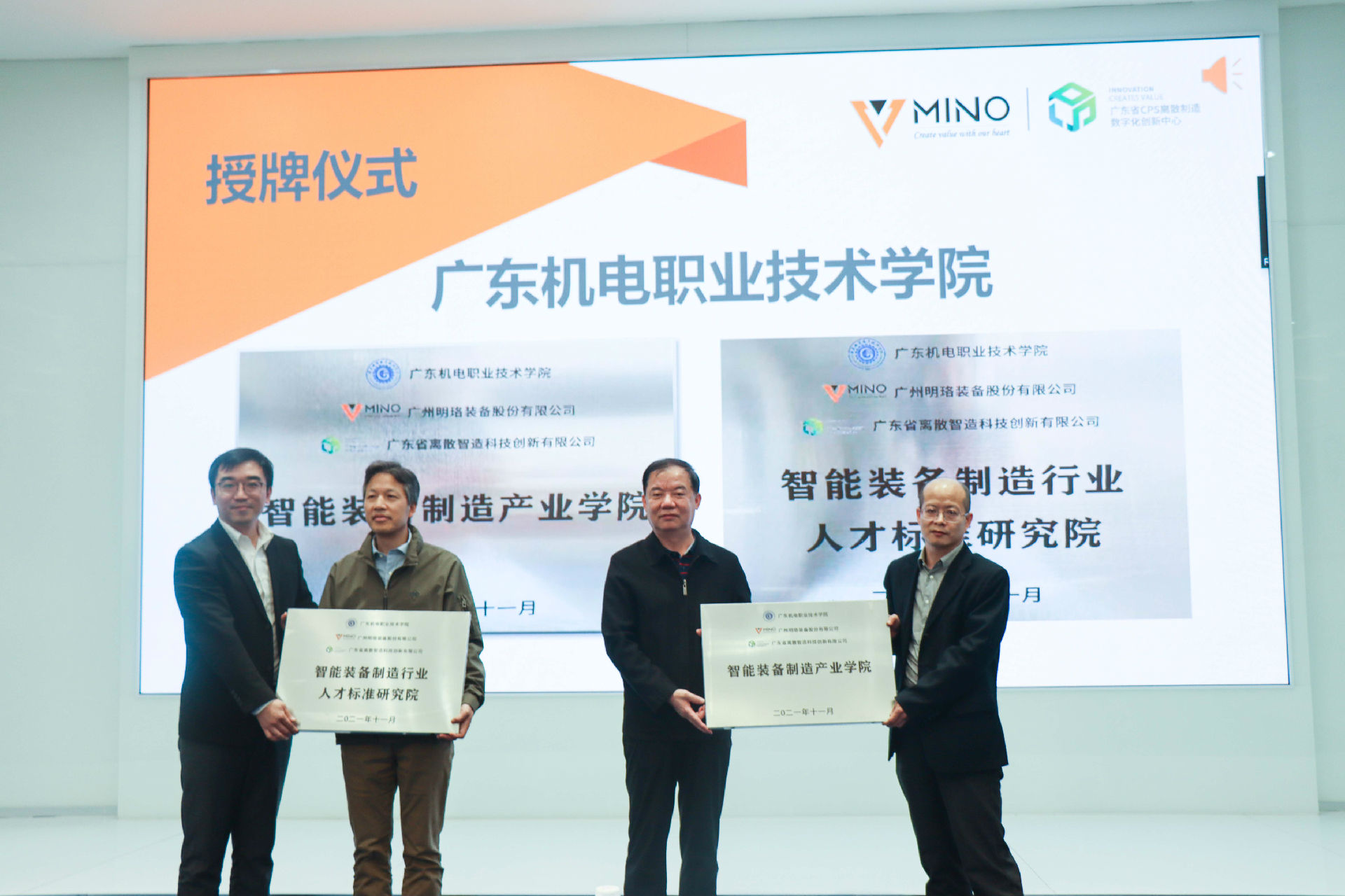 為推進(jìn)現(xiàn)代職業(yè)教育體系建設(shè),進(jìn)一步深化產(chǎn)教融合、校企合作,充分發(fā)揮職業(yè)學(xué)院教育教師人才培養(yǎng)的引領(lǐng)作用,加速培養(yǎng)符合智能制造行業(yè)發(fā)展需要的高素質(zhì)技術(shù)技能型人才。明珞裝備產(chǎn)品研發(fā)與智能制造事業(yè)部總經(jīng)理、廣東省離散智造科技創(chuàng)新有限公司總經(jīng)理左志軍與明珞裝備副總裁龍璞對廣東機(jī)電職業(yè)技術(shù)學(xué)院、廣州科技貿(mào)易職業(yè)學(xué)院、廣東交通職業(yè)技術(shù)學(xué)院、廣州番禺職業(yè)技術(shù)學(xué)院進(jìn)行授牌。