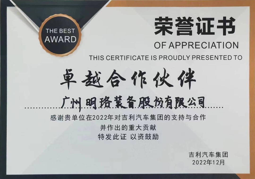 7年來(lái),明珞總拼系統(tǒng)高效穩(wěn)定的交付,獲得吉利多個(gè)生產(chǎn)基地的認(rèn)可。先后獲得吉利客戶頒發(fā)的金牌供應(yīng)商(2018)、產(chǎn)能提升獎(jiǎng)(2018)、優(yōu)秀供應(yīng)商(2019)、卓越貢獻(xiàn)團(tuán)隊(duì)(2021、2022)、集團(tuán)卓越合作伙伴(2022)。